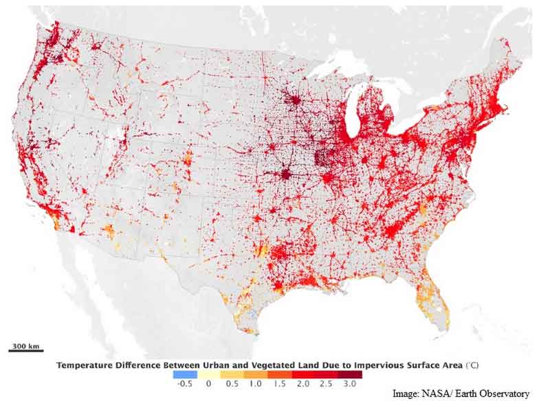 Een recent rapport van de NASA bevestigt het nog maar eens, en nu op basis van onderzoek in het gehele gebied van de VS. Weliswaar wordt het hitte-eiland-effect berekend op basis van saltellietbeelden, maar de conclusie is onomstotelijk: Meer groen is de enige oplossing, http://earthobservatory.nasa.gov/IOTD/view.php?id=86440