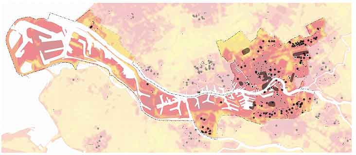 UPDATE: op 2 juli 2015 (tijdens de eerste hittegolf van 2015) publiceerde Cor Speksnijder in de Volkskrant een uitgebreid artikel over hitte-eilanden (met kaart) in Rotterdam (op het ergste bijna 10 graden heter dan de ‘officiële’ termperatuur). LEES het artikel HIER, waarin ook veel over bomen en groen. Klik op de kaart hieronder voor een grotere versie.